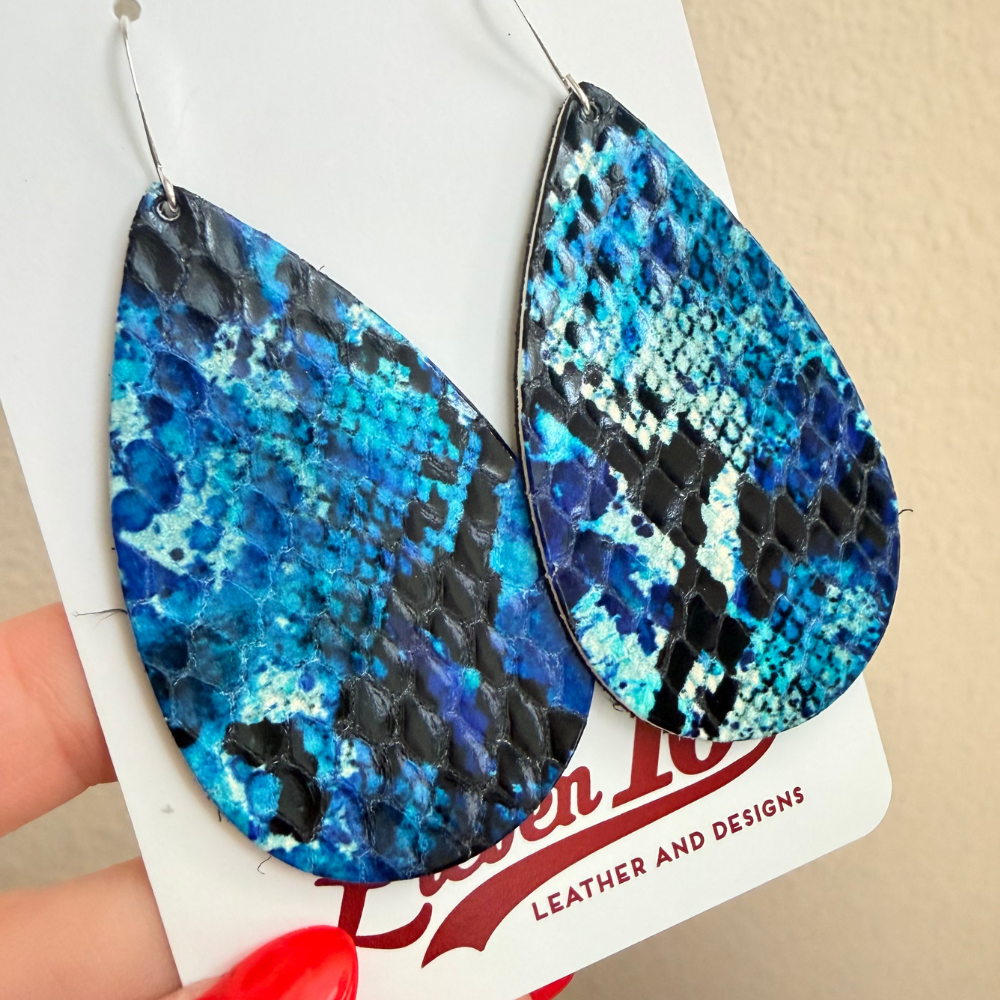 Blue Serpent Teardrop Leather Earrings - Medium is backordered and will ship as soon as it is back in stock.