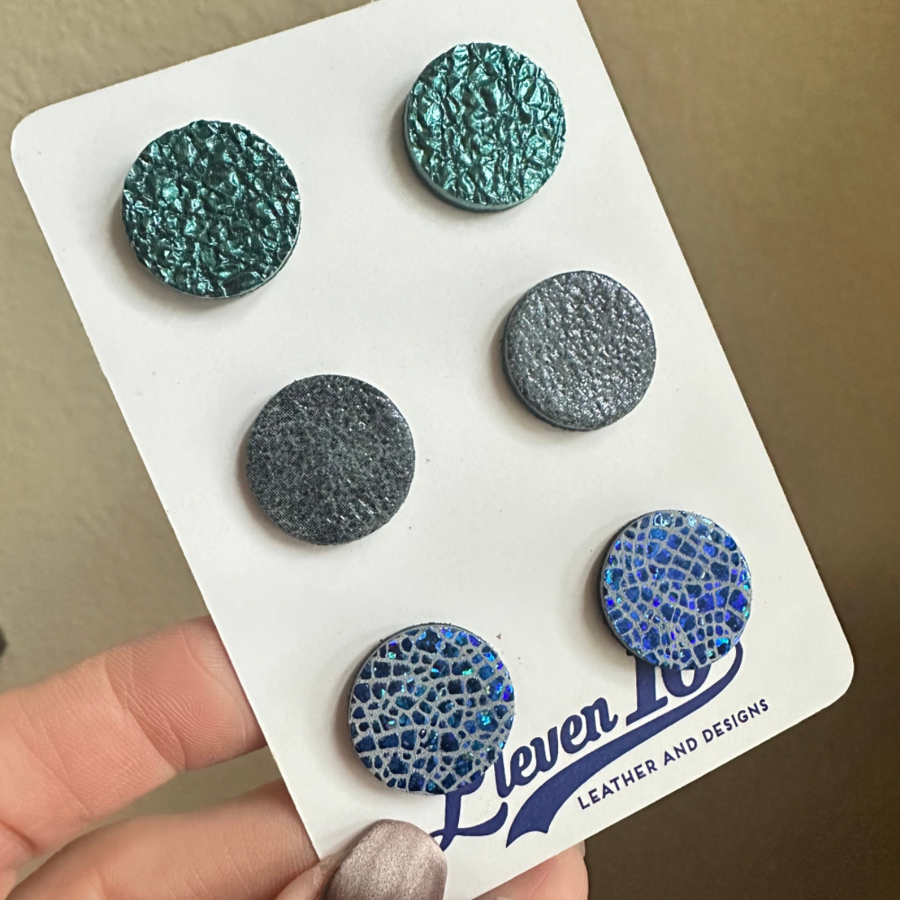 Feeling Blue Leather Studs - Small is backordered and will ship as soon as it is back in stock.