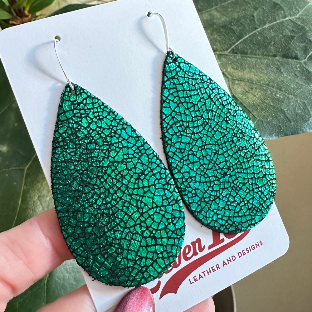 Green Crackle Teardrop Leather Earrings