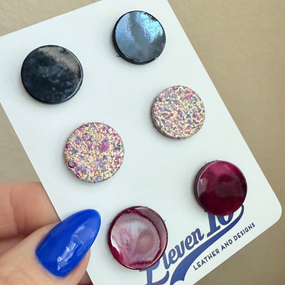 Fuchsia Tortoise Studs Leather Earrings - Small is backordered and will ship as soon as it is back in stock.